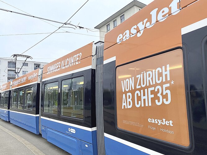 Dieses VBZ-Tram macht grossflächig Werbung für supergünstige Europaflüge von Easyjet. Auf dem Flexity-Tram heisst es: «Günstiger als ein Monatsticket – und das ab Zürich». Für AL-Politiker Michael Schmid ein absolutes No-Go. Er prangerte schon eine Zalando-Werbung an.