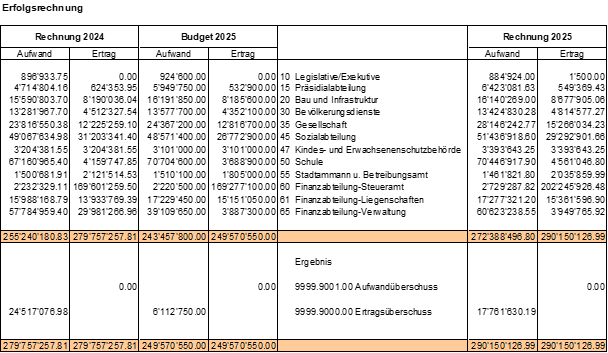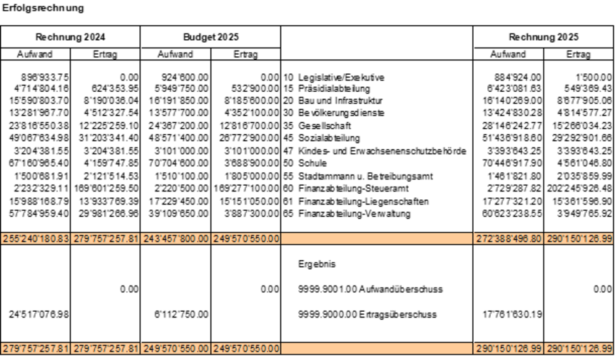 Die Erfolgsrechnung schliesst mit einem Ertragsüberschuss von CHF 17.8 Mio. ab. Das vom Gemeinderat genehmigte Budget sah einen Ertragsüberschuss von CHF 6.1 Mio. vor. Insgesamt resultiert ein Cashflow von CHF 29.9 Mio.